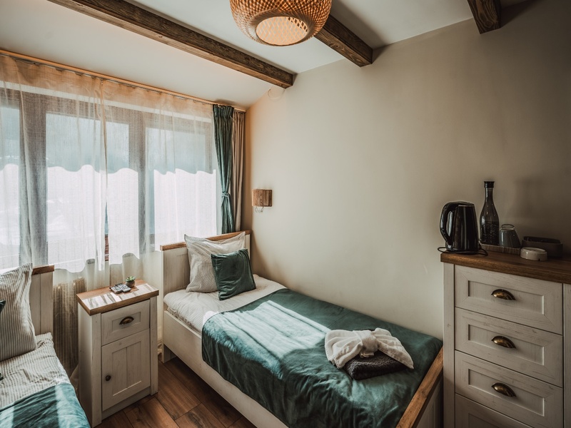 Двойна стая с допълнително легло – 13-16 кв.м., максимално настаняване 2 възрастни + 1 възрастен/дете; спалня и 1 единично легло, гардероб, TV, хладилник/минибар, ел. кана, санитарен възел с душ, кърпи, халати, чехли, козметика, сейф, Wi-Fi, еднократно зареждане с вода, всекидневно зареждане с кафе, чай.