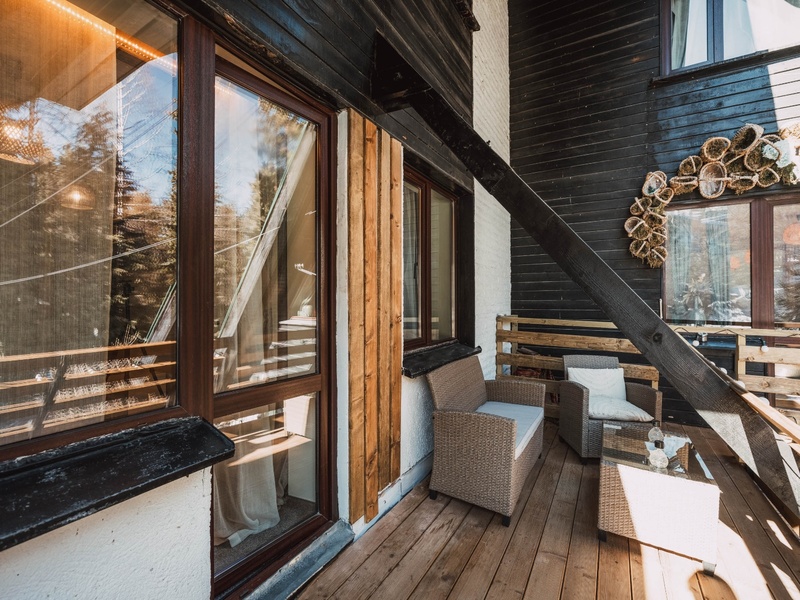 Огромна слънчева тераса и детски кът под шарената сянка на изящни брези са притегателно място за родители и деца.