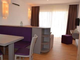 The villa has a pleasant living area with a fully equipped kitchen, a dining table with a bench and chairs, a corner sofa with a coffee table, a flat-screen TV and a desk to make you feel at home. The master bedroom has a wardrobe along the entire wall, a bedroom measuring 200 cm by 160 cm and bedside tables. The parents' bathroom is equipped with two washbasins, a shower cabin and a toilet, as well as a second separate toilet. The interior is designed in pastel relaxing colors, which contribute to comfort and coziness. Villa Albena offers accommodation for 4 people. Check-in takes place at the reception of Arabella Beach Hotel.